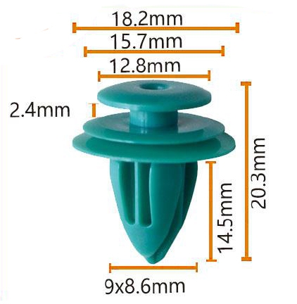 Сваки Кеепеи Фастернер има прецизне димензије које су ригорозно тестиране да би се осигурало савршено уклапање са ГМ возилом. Дужина 20,3 мм, ширина 9,6 мм и пречник рупе од 8,6 мм. Зелени пластични материјал са високом чврстоћом изабран је за његову издржљивост, отпорност на хабање и способност да издрже екстремне температуре и услове.